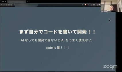 “自分がコードを書けないからAIに書かせる”のと、“自分でもコードを書けるけどAIの方が早いからAIに任せる”のとでは大きく違いがあり、後者じゃないと開発現場では厳しい。なぜなら、ある程度自分で書けなければ、AIが書いたコードの是非を判断できないからです。