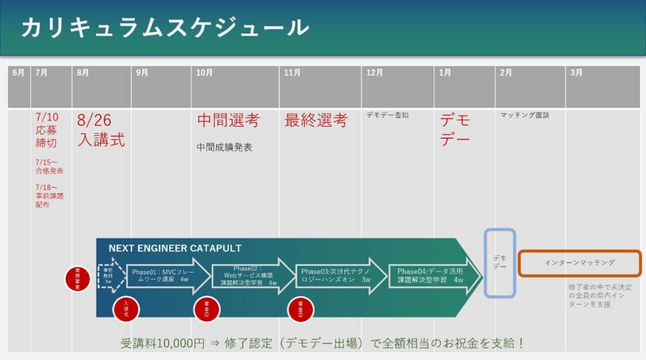 プログラムの集大成は、2026年1月に予定される最終成果発表会(DEMO DAY/デモデイ)です。受講生は半年間で身につけた技術と成果を披露し、協力企業や市内企業とのインターンマッチングの機会を得ます。