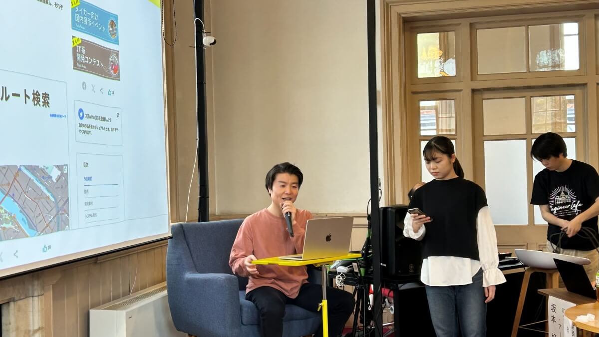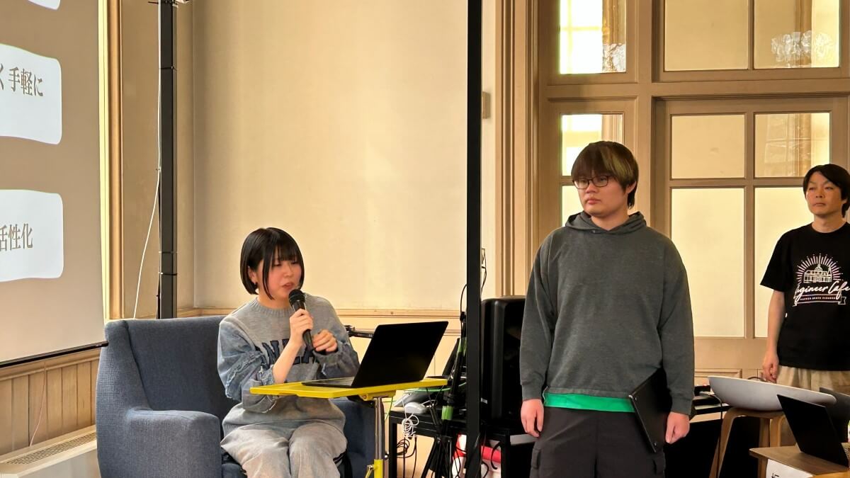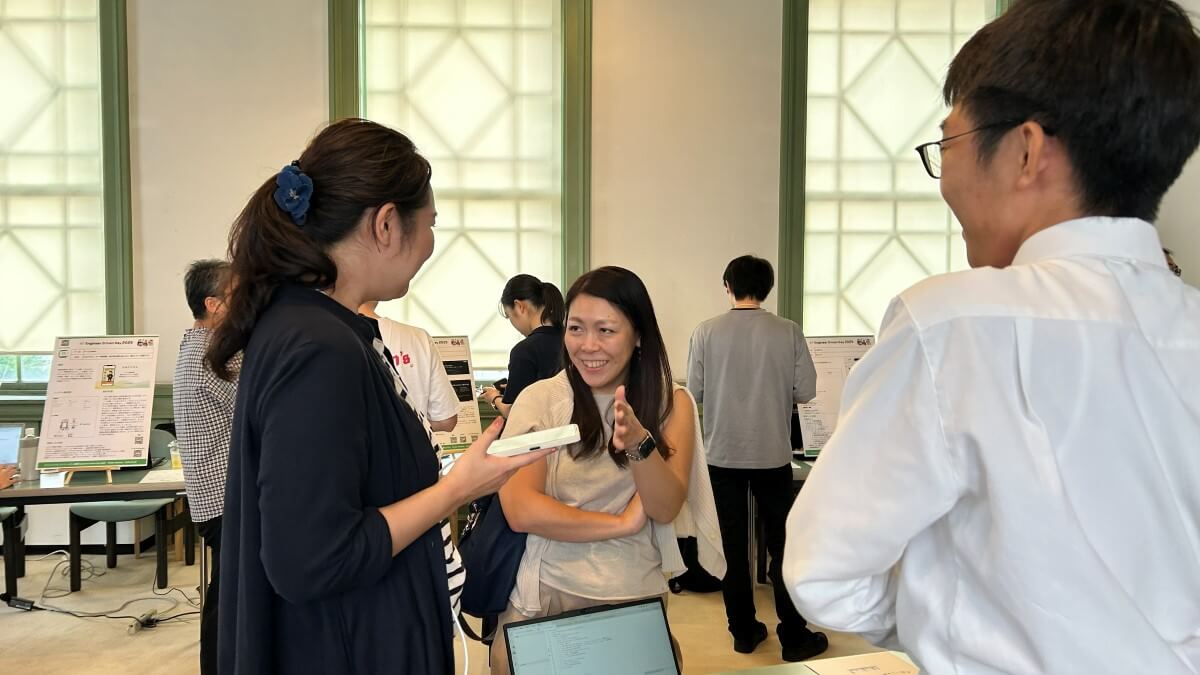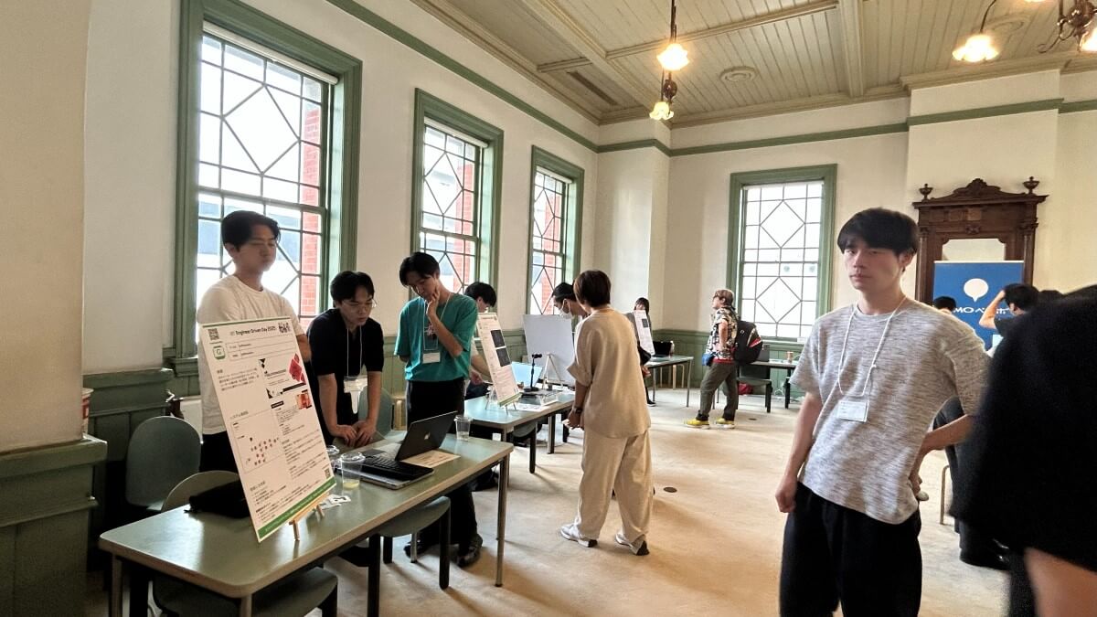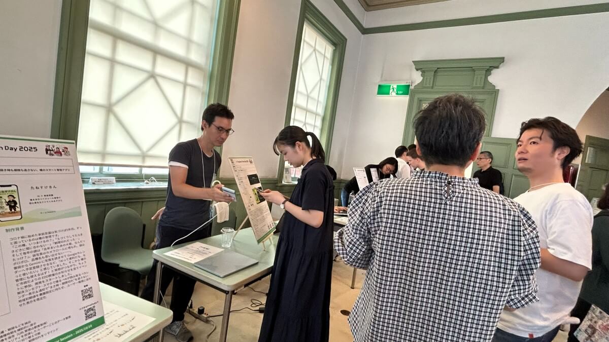 展示ブースには学生チームや社会人エンジニアに加え、小学生や高校生など幅広い層の参加者が並びました。アイデア重視の作品から完成度の高いプロダクトまで多彩な内容がそろい、来場者が足を止めて質問したり、参加者と熱心に意見交換を行ったりする様子が印象的でした。