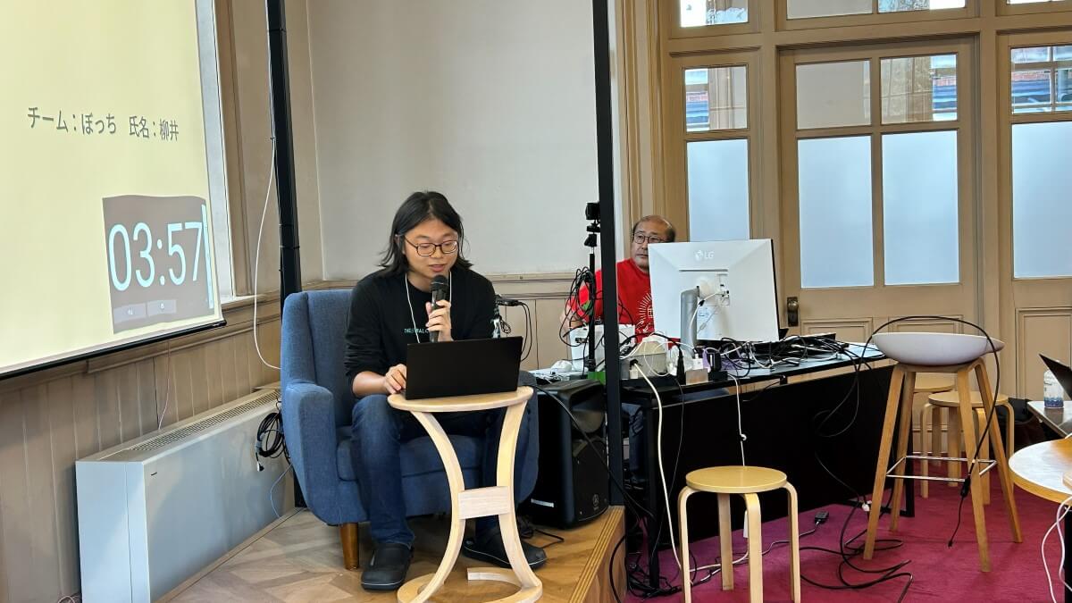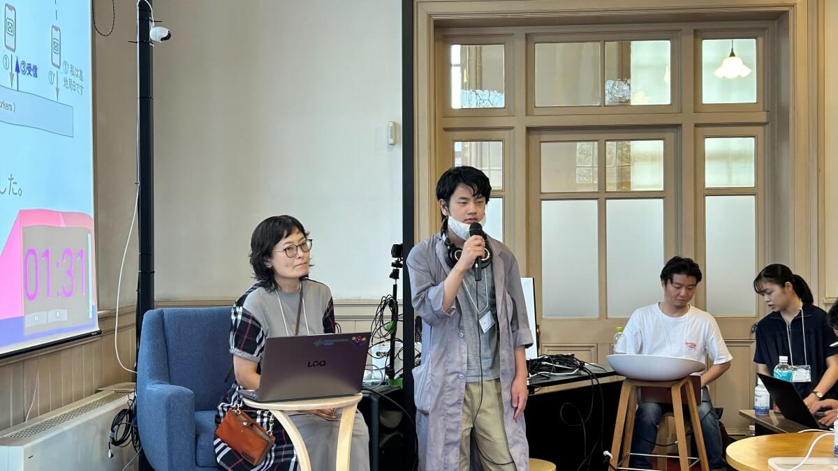 審査会場では参加者によるプレゼン(LT)が行われ、緊張感の漂う中、限られた時間で工夫を凝らした発表が続きました。発表後には評価委員から質問や助言が寄せられ、作品の改善につながるヒントを得る姿も見られました。