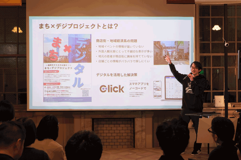 本プロジェクトは、まちの課題をデジタルの力で解決することを目的とした取り組みです。今回は福岡市中央区にある唐人町商店街を舞台に、大学生たちが商店街の課題解決に挑みました。使用する技術をノーコードアプリ「Click」に限定し、このツールを活用しながら「どうすれば商店街がより良くなるか」を検討しました。