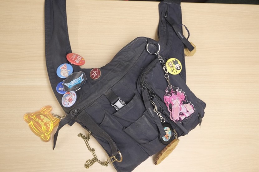 へのへのんさん私物バッグ。愛着のあるキャラクターやバッジでいっぱい